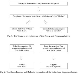 People suffering from Capgras delusion believe their loved ones were replaced by impostures. A loved one may look the same, but no longer “feels” the same. Another possibility, is while a loved one may look the same, but no longer “feels” the same because the patient believes that he or she is dead. In that case, the delusion is known as Cotard.