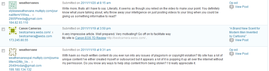 Every so often, I get a piece of spam that I think is real ham. Every so often, I receive a spam comment that I mistake for a real comment. Sometimes, it’s the other way around. Focus first on the bottom comment. It threw me off for a second. I clicked on the link provided and everything. Nothing seemed spammy about the page, but I wasn’t about to jump in and reply because I hate speaking to machines – which is why I always hang up the phone with an automated call shakes me awake. Because a spambot doesn’t read posts – because robots are, as we all know, illiterate – the second comment set my suspicions straight. The top comment, of course, confirms no reading was had because the post it responded to contained no video. And that, ladies and gentlemen, is my post for the day.