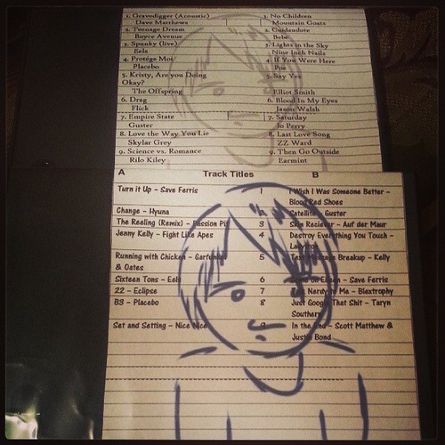 Last night, I compiled and burned two playlists that I dubbed the soundtrack to this blog. Featuring songs I embedded, mentioned, or quoted (in titles or otherwise) on this blog for the last three years (Oh My Wow, right‽). The CDs are meant for my quote/unquote “sisters,” Miranda and my butt-faced hipsis, Ashton Cutright. The two copies you see in Exhibit A were burned for my co-worker, Angela, who started with Volume 2. Tsk tsk tsk.