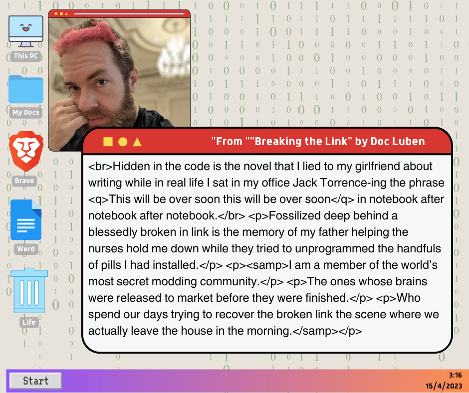 Hidden in the code is the novel that I lied to my girlfriend about writing while in real life I sat in my office Jack Torrence-ing the phrase “This will be over soon this will be over soon” in notebook after notebook after notebook fossilized deep behind a blessedly broken in link is the memory of my father helping the nurses hold me down while they tried to unprogrammed the handfuls of pills I had installed. I am a member of the world’s most secret modding community the ones whose brains were released to market before they were finished who spend our days trying to recover the broken link the scene where we actually leave the house in the morning.