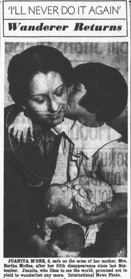 Her mother, Bertha McGee, never doubted her daughter for a second. She knew Juanita was smart enough to find her way through the city. Nevertheless, the police assisted with locating her wander-ful child, who had decided to visit the Sixth St. NW house of a friend.