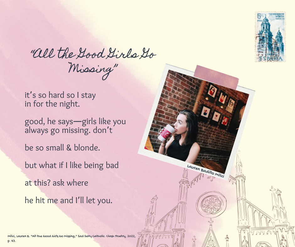 Milici, Lauren B. “All the Good Girls Go Missing,” Sad Sexy Catholic. Clash Poetry, 2022, p. 43.