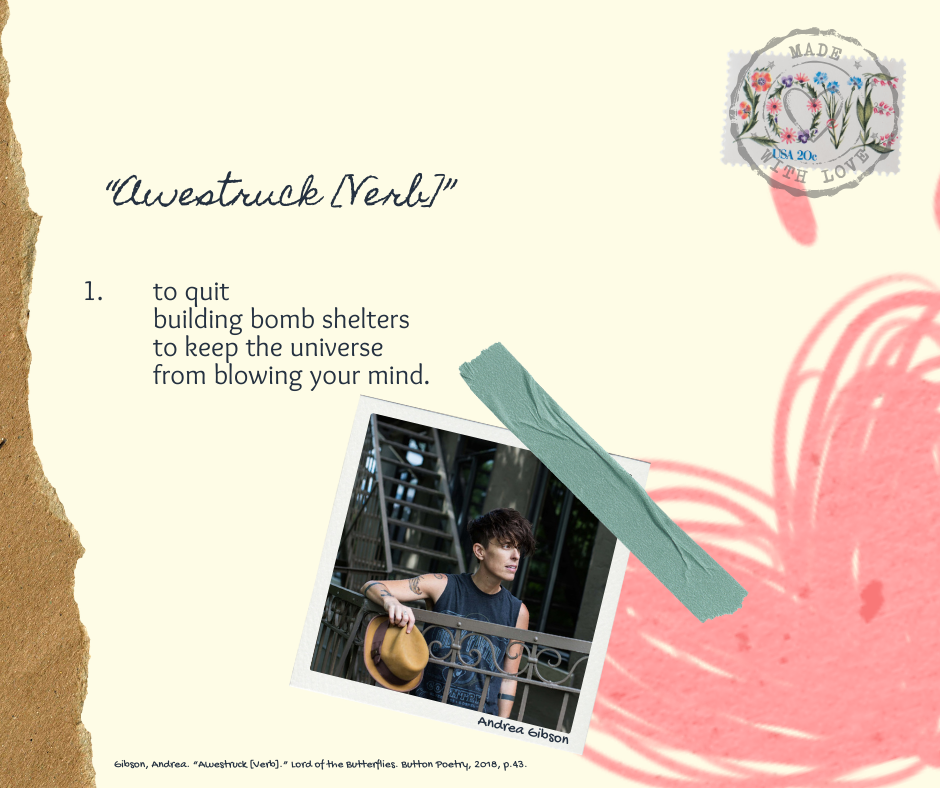 Gibson, Andrea. “Awestruck [Verb].” Lord of the Butterflies. Button Poetry, 2018, p.43.
