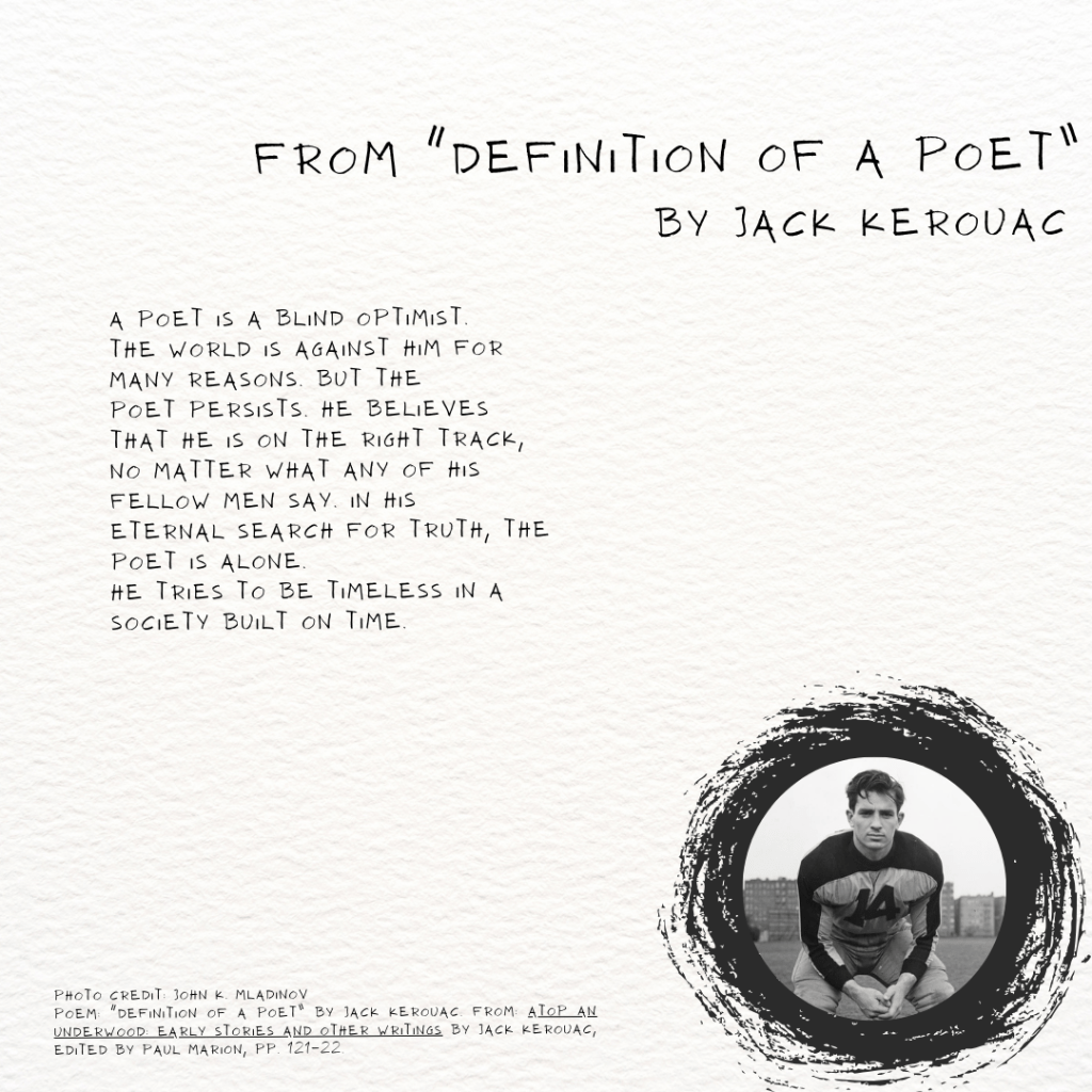 Jack Kerouac (1922-1969) was a pioneer of the Beat Generation, a literary subculture movement which included writers and poets such as Allen Ginsberg, William S. Burroughs, and Herbert Huncke. He is most known of his 1957 autobiographical, novel, On the Road, which is based on his travels across the United States. His poem, “Definition of a Poet,” can be read in the pages of Atop an Underwood: Early Stories and Other Writings (Penguin).