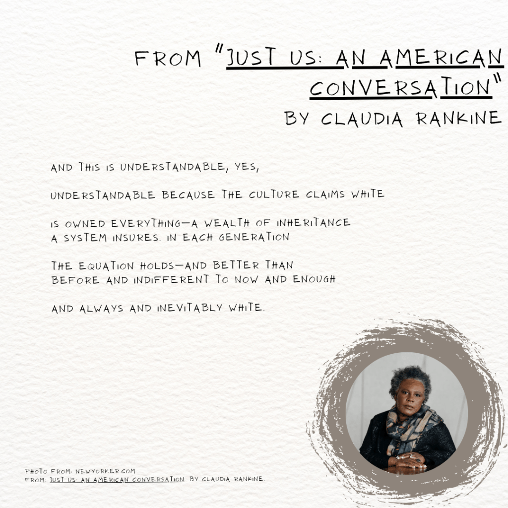 Claudia Rankine is an American poet, essayist and playwright. Her books include Citizen: An American Lyric, The White Card: A Play, and Just Us: An American Conversation. Her work has appeared in anthologies such as The Garden Thrives: Twentieth Century African-American Poetry and Great American Prose Poems: From Poe to the Present.