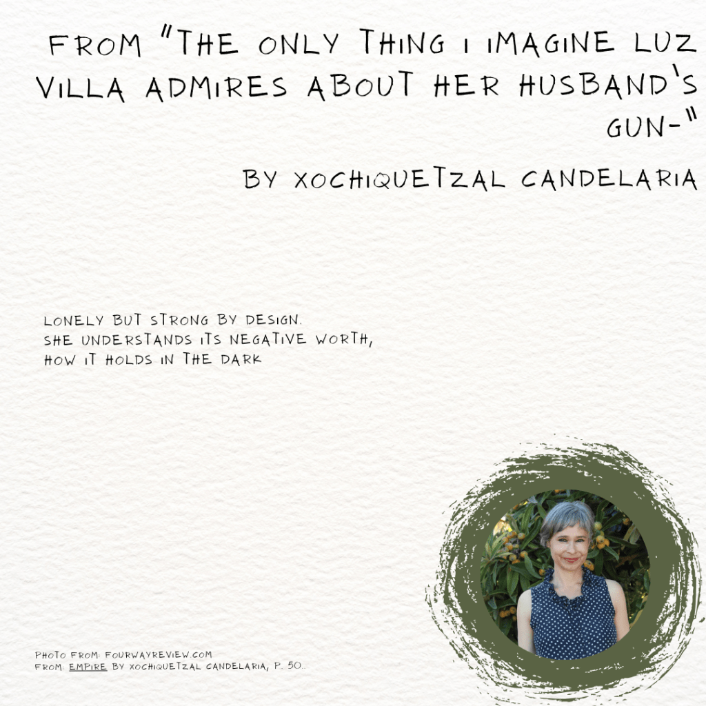Xochiquetzal Candelaria is an American poet whose work has appeared in The Nation, Gulf Coast, The Seneca Review, and Poetry, where you can continue reading this poem. She is the author of Empire and Show Me the Bells.