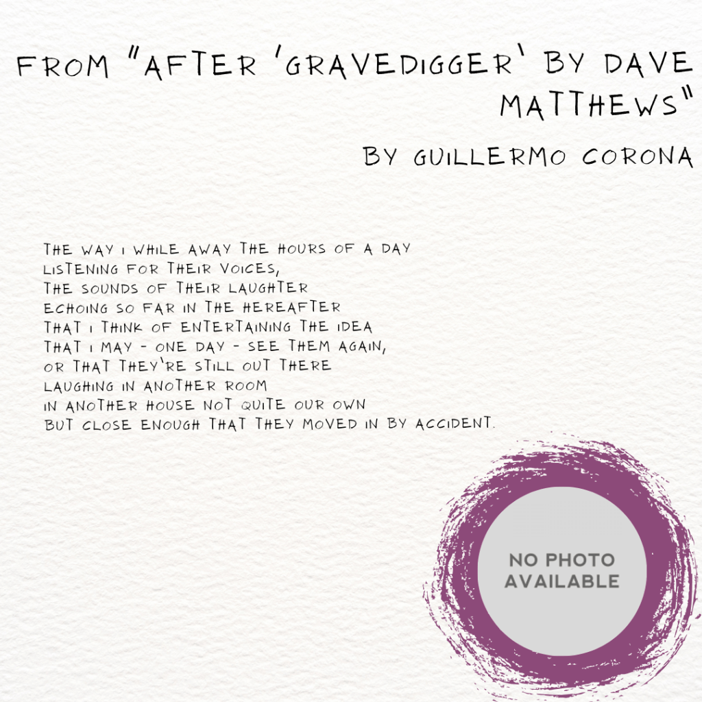 “after ‘Gravedigger’ by Dave Matthews” was work that took me years to write, beginning with a blog post on 18 November 2010. Two tragic events happened in my life between then and the (semi) completion of the poem. Those tragedies are the loss of my friends (though, they were family) in a 2018 car accident where my son’s mother was the sole survivor, and the passing of my own father the following summer. When I revisited the poem again, it was shortly after the passing of my last living grandparent. As it stands, “after ‘Gravedigger’ by Dave Matthews” has been undergoing revision after revision for the last 15 years. There are too many people I have lost to ignore, though I do not know how to include them in this poem. And I really wish I could.