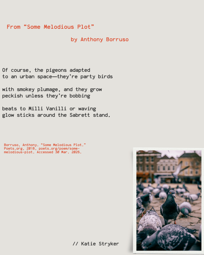 There was something playful about Anthony Borruso’s “Some Melodious Plot” that drew my attention. Perhaps it was the absurdity of the quote that introduces his poem, something lifted from a Official Birds Aren’t Real Informational Van Bumper Sticker. At times, I can’t tell if the “birds aren’t real” folk are true conspiracy theorists or if a meme gained a life of its own, grew legs, and continues to walkabout this world. Either way, during all the chaotic news stories this world has to offer, it is always fun to take a pause.