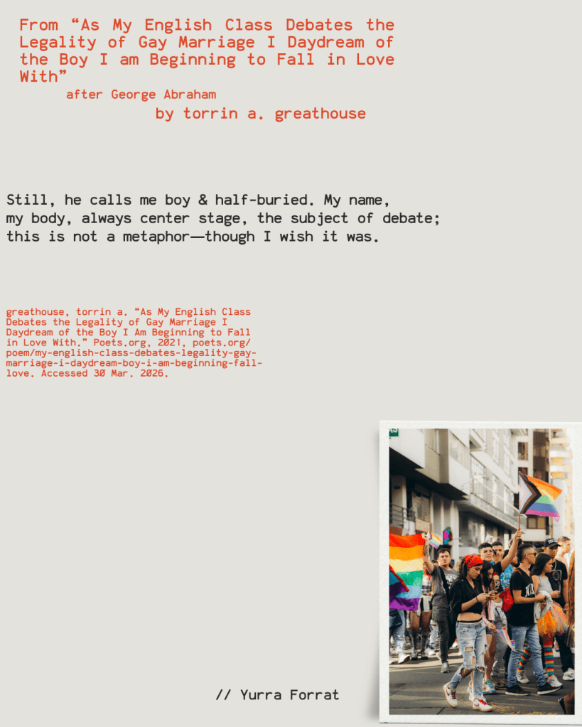 Sometimes I pick a poem because of its message/story. Other times, it’s because the style. When it comes to “As My English Class Debates the Legality of Gay Marriage I Daydream of the Boy I am Beginning to Fall in Love With” by torrin a. greathouse, it’s both.