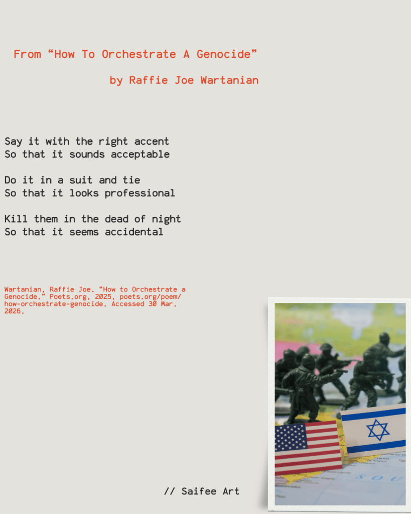 Raffie Joe Wartanian’s “How To Orchestrate A Genocide” adds to the conversation, showing how we can normalize a genocide in the twenty-first century. Or maybe not normalize so much as ignore what has been happening to the people of Palestine for decades.