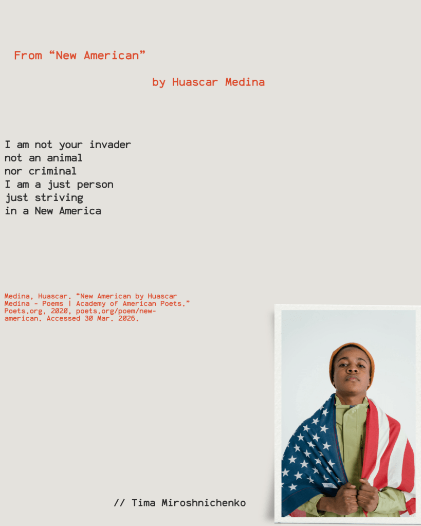 In a similar theme to Valeria Ruiz’s “You Know Me,” Huascar Medina explores the immigrant experience and the tensions between the dual identity of being an immigrant (or child of immigrants) and being a citizen to this country. He doesn’t idealize the old American Dream (“This is New America/student loans for all/high rent /higher utilities /low pay/rising healthcare costs/the cost of living/—deadly), but dreams of a New America (We all dream of a greater America/I want you to be paid a living wage/live in affordable housing/without college debt/or medical debt/or credit card debt/or national debt/I want no more racism”).