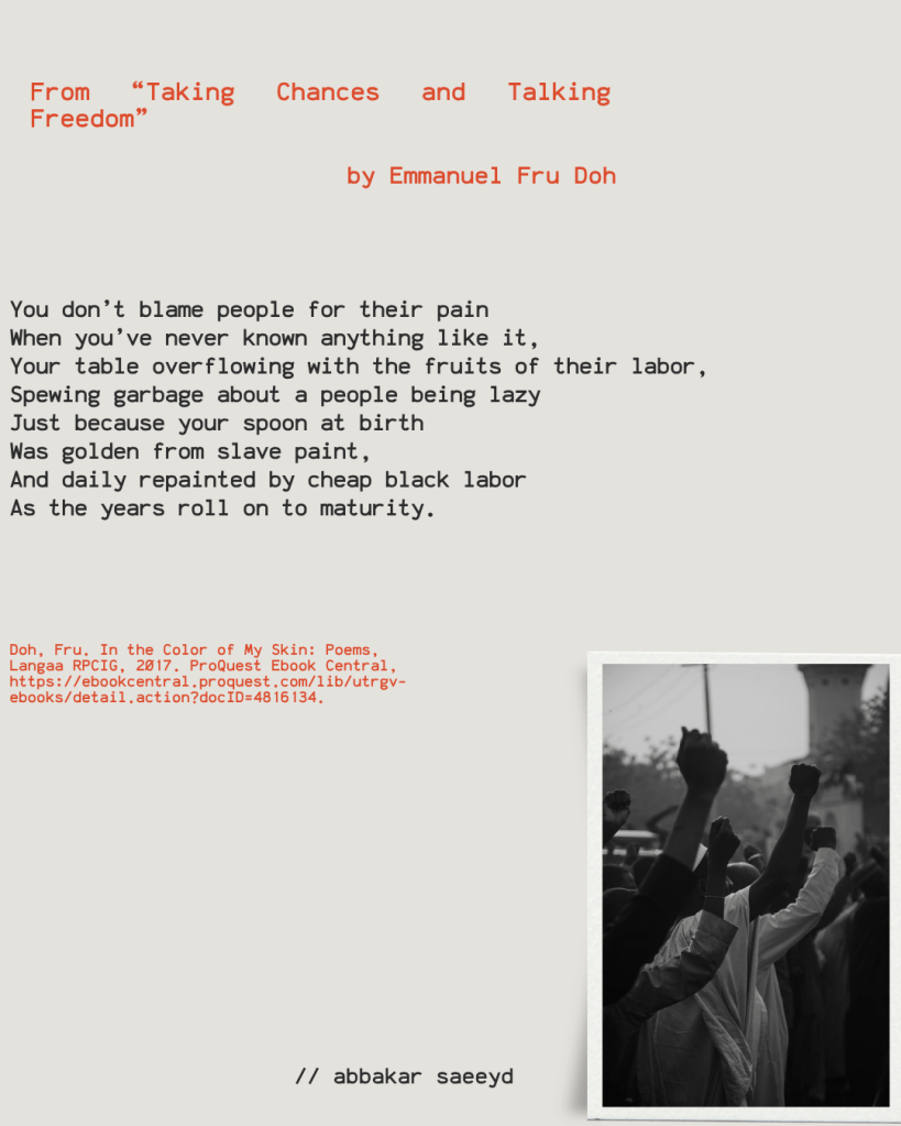 That’s what I took from Emmanuel Fru Doh’s “Taking Chances and Talking Freedom.” How white people and the top 1% will build the myth of the self-made man, but hide the broken backs of prosperity beneath the rug. The bones of the enslaved hidden in the foundations of empires, the blood of the indigenous spilled to fertilize the lands.