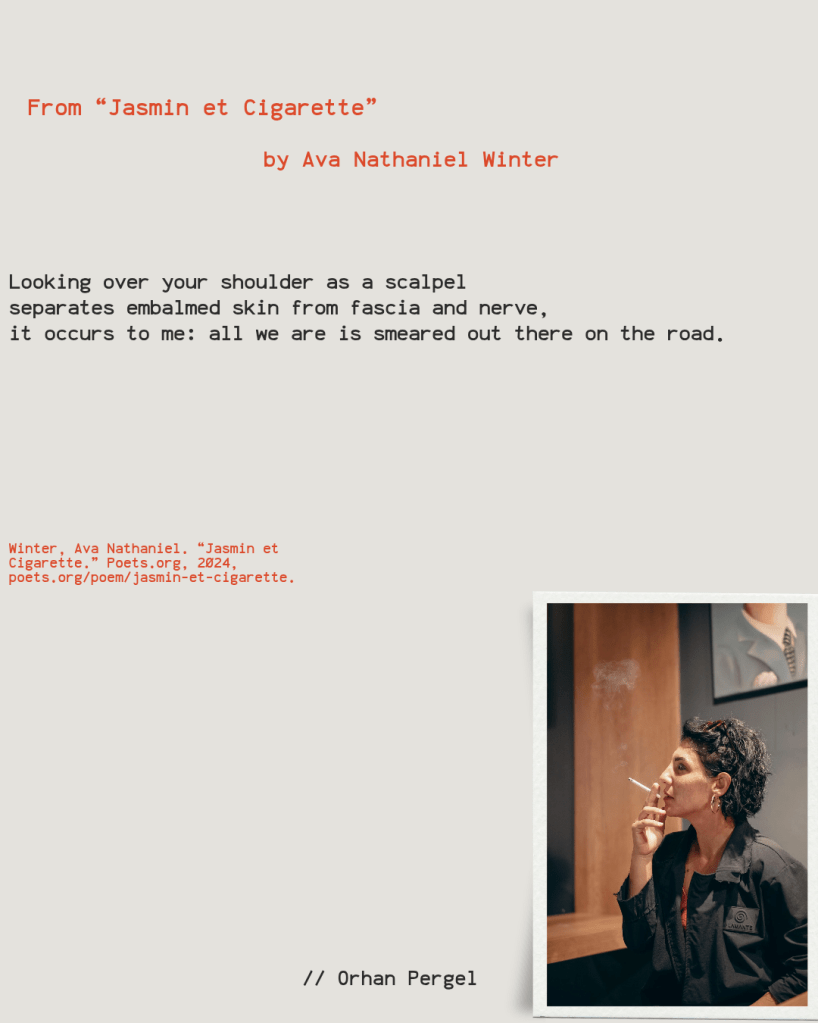 I love imagery Ava Nathaniel Winter uses in her poem, the way she juxtaposes flashes of beauty with the grotesque. Even the title, “Jasmine et Cigarette”—although, an actual fragrance—plays into this juxtaposition. Even her use of “indolic” stands out. In the world of perfumes, indole is “a naturally-occurring chemical, found in many essential oils”1 including jasmine. While in the medical world, which Winter references multiple times, indolic is associated with decay.2