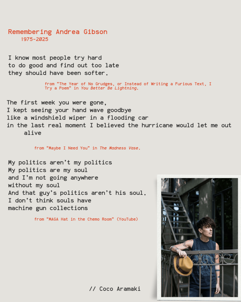 Andrea Gibson’s words became an extension of my heart. They were the words I needed as an adult, but also words that spoke to that forgotten queer adolescent I had been once. Their work became a staple of my gift giving. I think I’ve purchased their work for a few of my friends. And I love sharing their poems with others. Introducing them to people I meet.